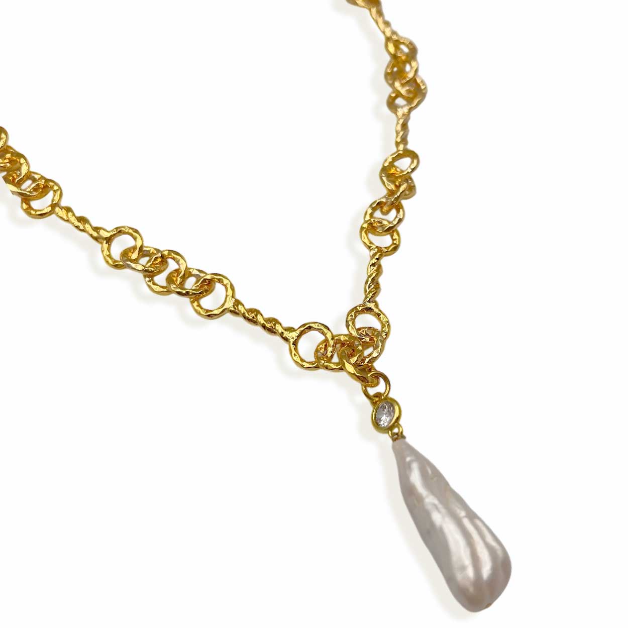Zarafetin doğallıkla buluştuğu bir tasarım: Delmara Barok İnci Zincir Kolye. Her biri kendine özgü formda olan doğal barok inciler, altın rengi halkalı zincirin modern ışıltısıyla bir araya geliyor. El işçiliğiyle tasarlanan bu özel kolye, hem gündüz şıklığında hem gece ışıltısında stilinizi tamamlamak için tasarlandı.