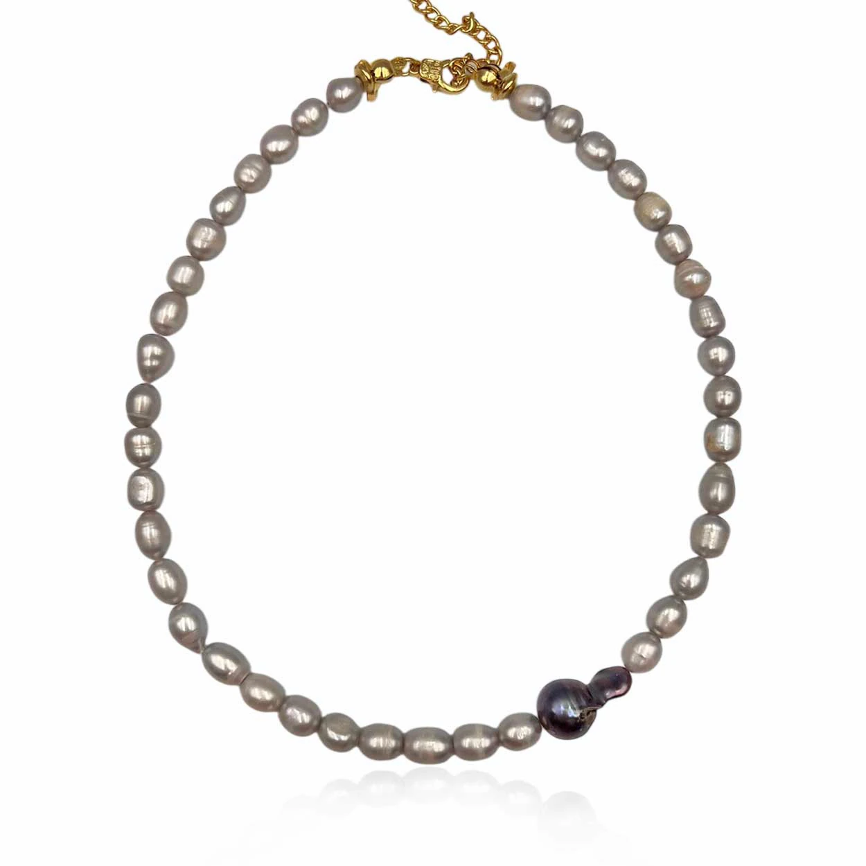 Doğal gri incilerle ve siyah barok inci ile hazırlamış Elowen Kolye 40 cm ölçüsündedir.